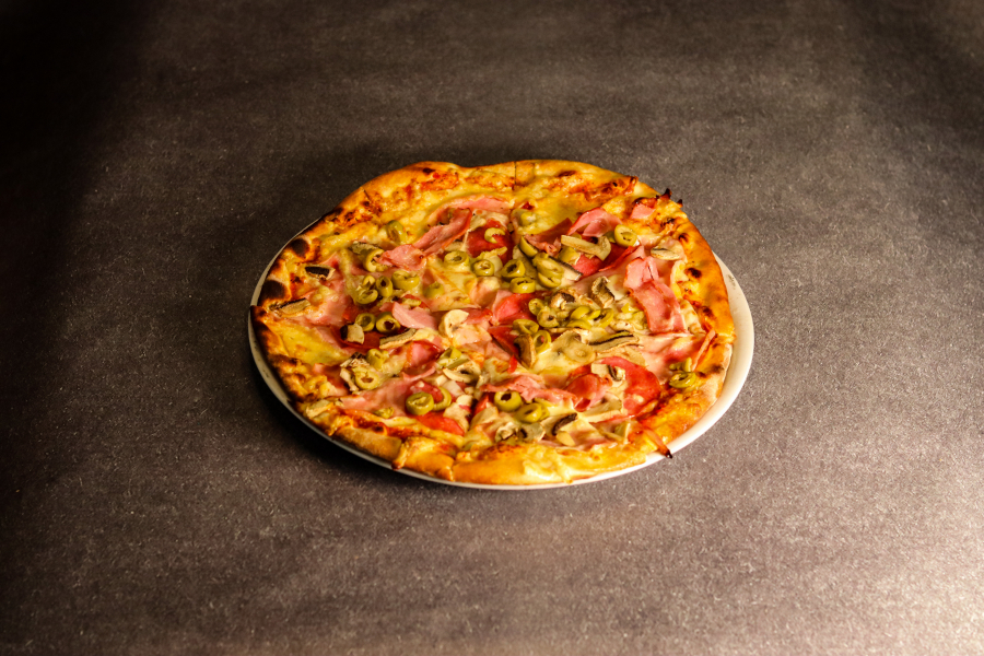 570g, paradajkový základ, šunka, pikantná saláma, chilli papričky, kukurica, syr Mozzarella