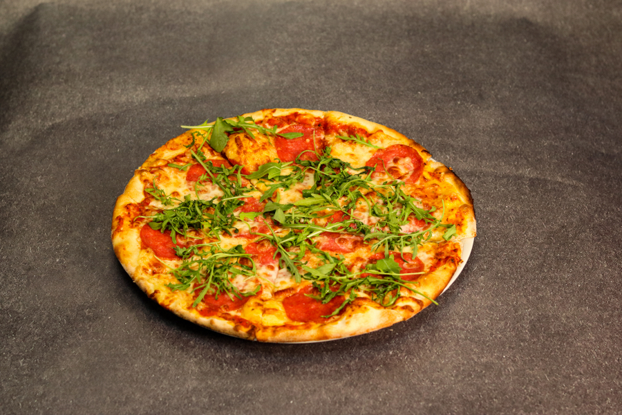 530g, paradajkový základ, syr Mozzarella, saláma, rucola
